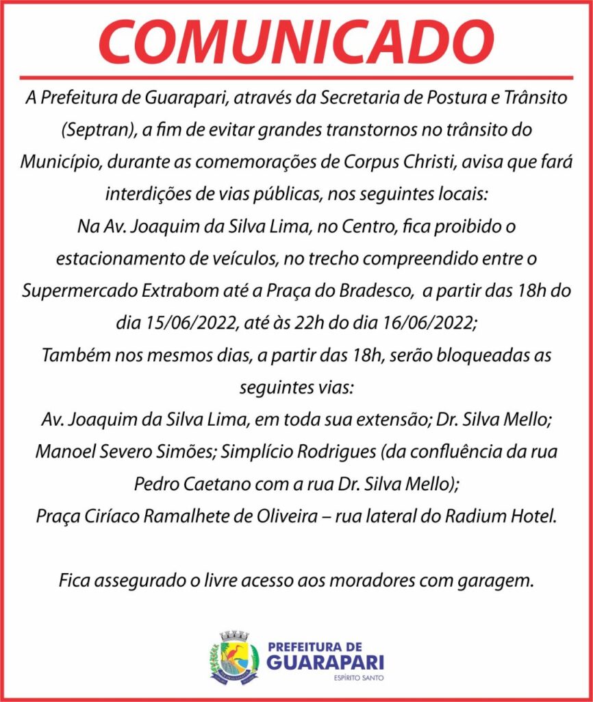 A Prefeitura de Guarapari, através da Secretaria Municipal de Postura e Trânsito (Septran), a fim de evitar grandes transtornos no trânsito do Município, durante as comemorações de Corpus Christi, avisa que fará interdições de vias públicas.