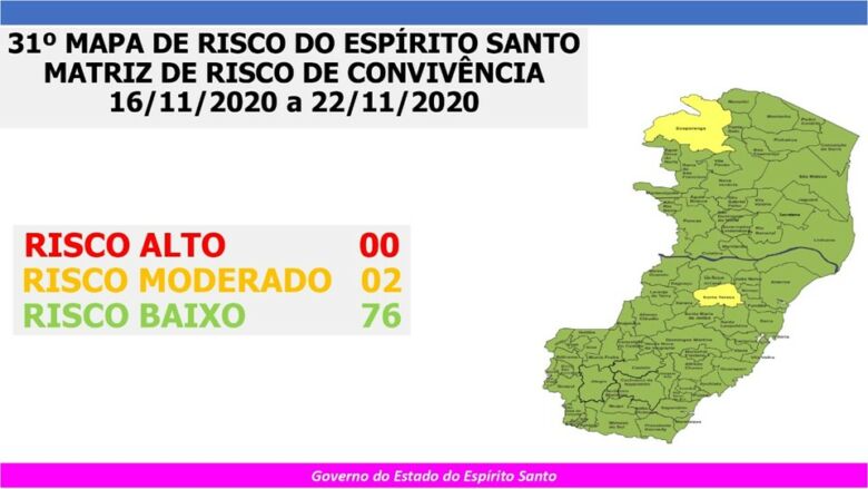 Do total de municípios capixabas, 76 estão classificados em Risco Baixo. Entre eles: Guarapari, Alfredo Chaves e Anchieta. Somente dois permanecem em Risco Moderado (Ecoporanga e Santa Teresa). Não há nenhum município em Risco Alto.