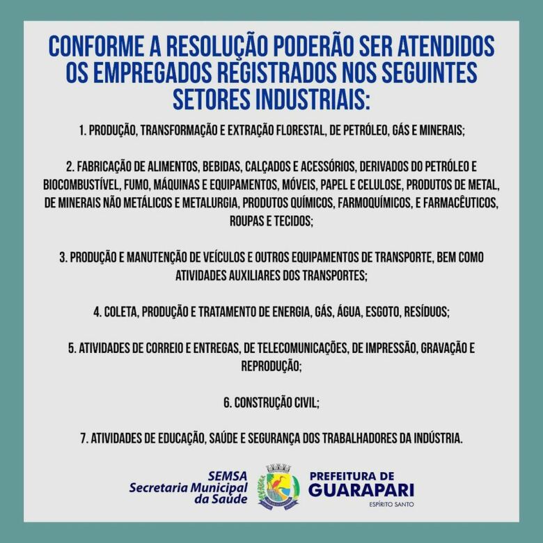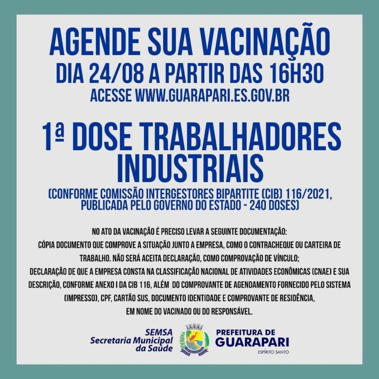 A Prefeitura de Guarapari divulgou, na manhã desta terça-feira (24), a abertura de agendamento para aplicação de primeira dose de vacina contra a Covid-19 para os trabalhadores industriais. O agendamento acontece ainda na terça-feira (24).