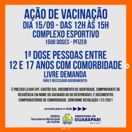 Guarapari vai realizar, na tarde desta quarta-feira (15), uma nova ação de vacinação contra a Covid-19, voltada para a imunização de pessoas entre 12 e 17 anos com comorbidades.