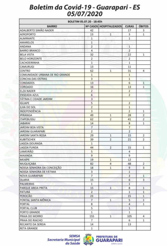 O Boletim Epidemiológico divulgado na noite de domingo (05), pela Prefeitura Municipal de Guarapari, através da Secretaria Municipal de Saúde, mostra novas atualizações de dados ligados ao Coronavírus, mas casos de pacientes curados e óbitos, seguem os mesmos.