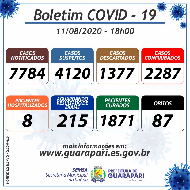 Ao todo, o município contabiliza 7.784 casos notificados. Destes, 4.120 são suspeitos, 1.377 foram descartados, 2.287 confirmados e 215 permanecem em investigação laboratorial. Dentre os confirmados, 1.7871 pacientes estão curados, 8 permanecem hospitalizados e 87 vieram a óbito.