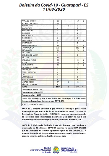 O boletim epidemiológico divulgado hoje (11) pela Prefeitura Municipal de Guarapari, por meio da Secretaria Municipal de Saúde (Semsa), atualiza o número de casos confirmados no município para 2.287, 30 a mais que ontem (10). Embora o número de óbitos tenha permanecido inalterado, uma nova morte foi registrada no bairro Condados. Isso porque o Município retificou, por meio de nota, um óbito em Reta Grande, divulgado no dia 03 deste mês. O erro teria sido do hospital, que registrou por engano o óbito de uma paciente que segue internada até o presente momento