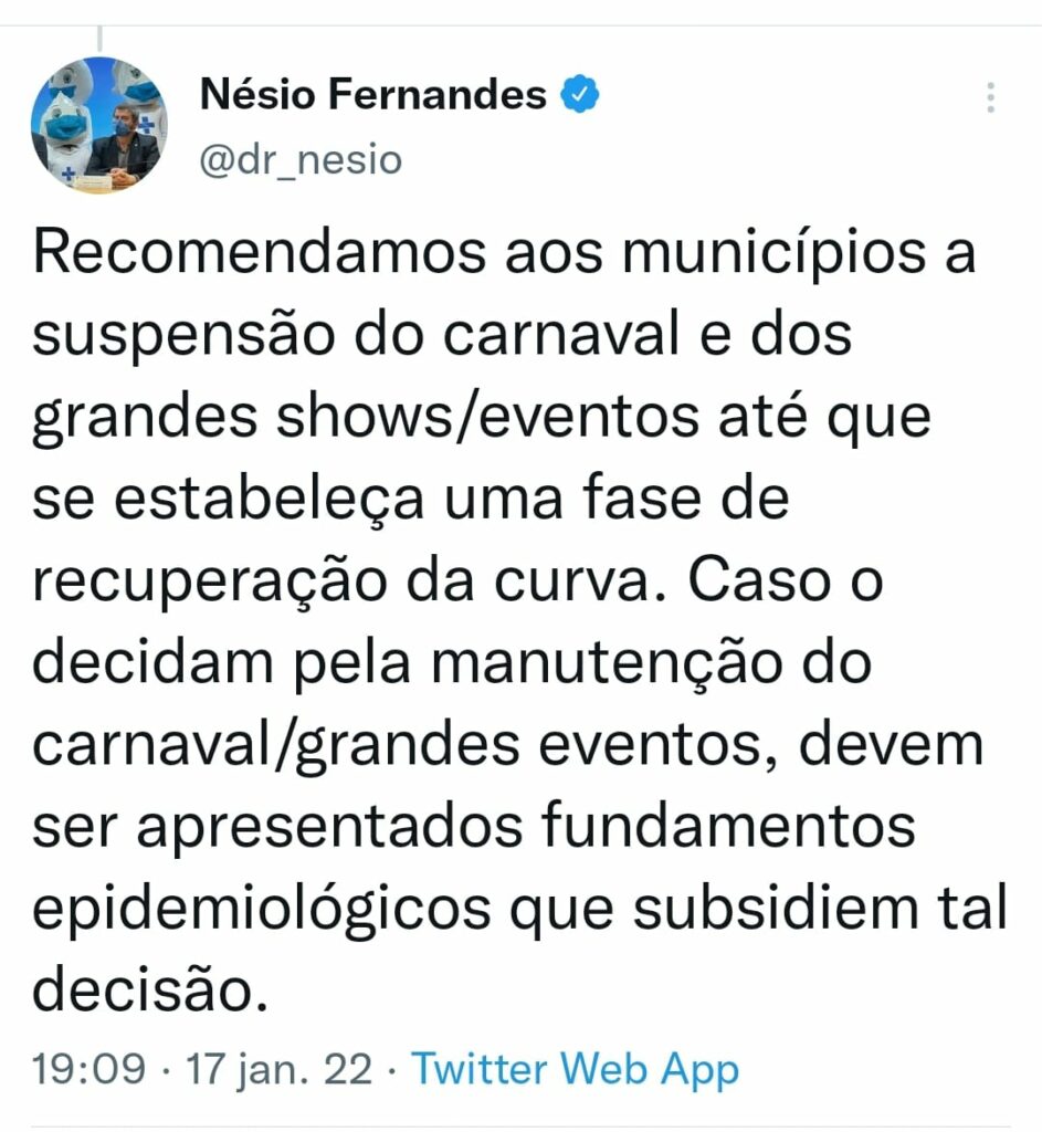 Por conta desta atual situação sanitária no Estado, a Sesa recomendou aos municípios que suspendam o Carnaval de rua, além de grandes shows e eventos. As cidades que decidirem por não acatarem a recomendação, deverão apresentar embasamento técnico, levando em conta dados epidemiológicos para sustentar a escolha.