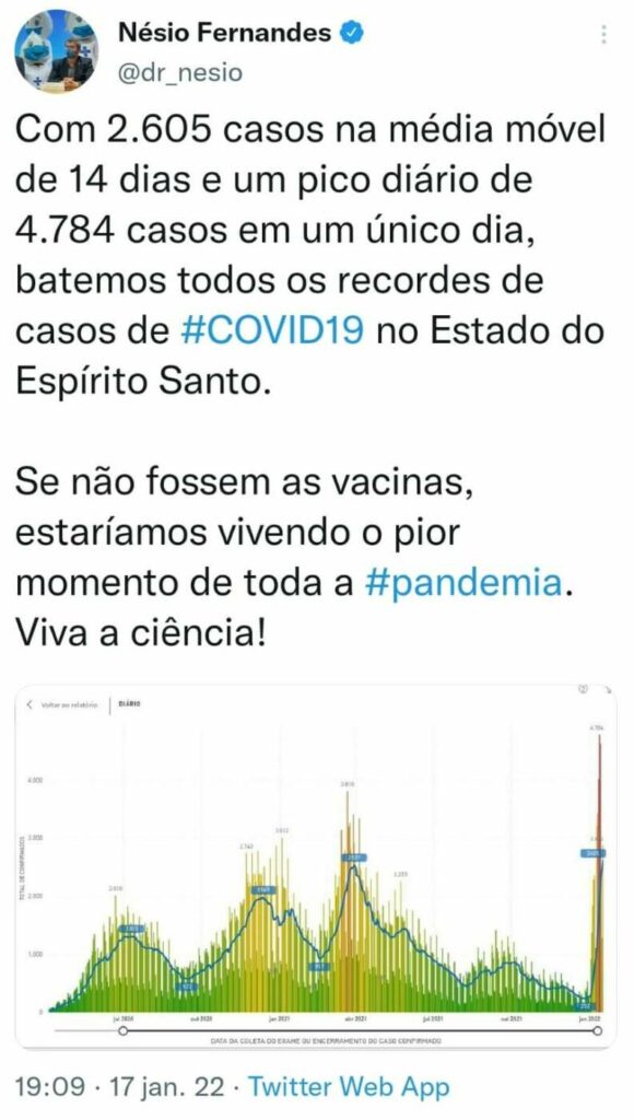 De acordo com o secretário, o Espírito Santo ainda vive um momento de aceleração rápida da curva de casos de Covid-19 em simultaneidade com a epidemia de influenza. Segundo Nésio, sete municípios alcançaram uma taxa de incidência superior a dois dígitos em números de casos por mil habitantes: Vitória, Ponto Belo, Linhares, Rio Bananal, Mucurici, São Gabriel da Palha e Guarapari.
