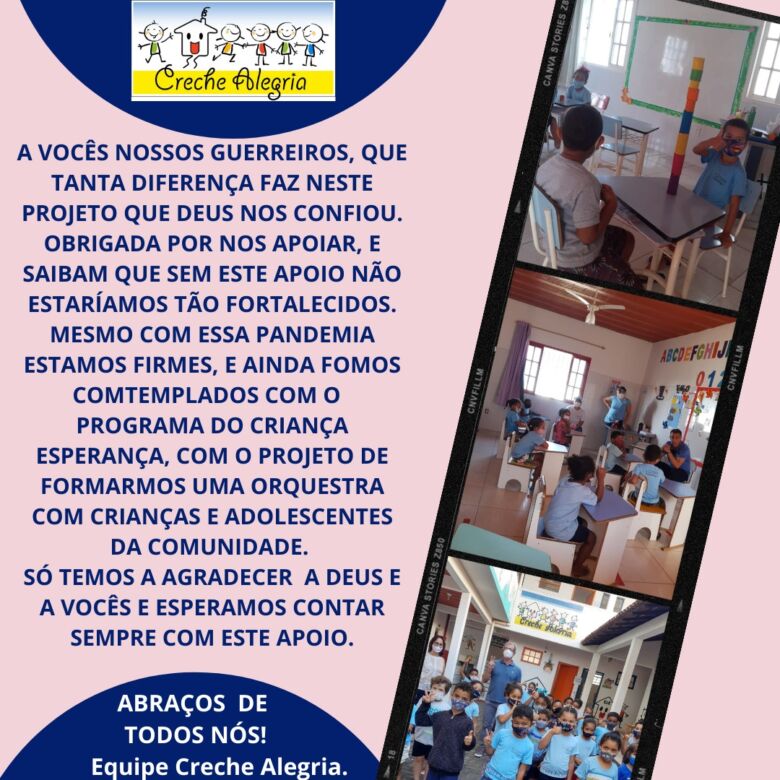 A Creche Alegria segue precisando da ajuda de colaboradores para manter o local e a qualidade no atendimento das crianças. Lançada em 2017, a campanha 300 Guerreiros da Alegria foi idealizada por essa necessidade de ajuda financeira.