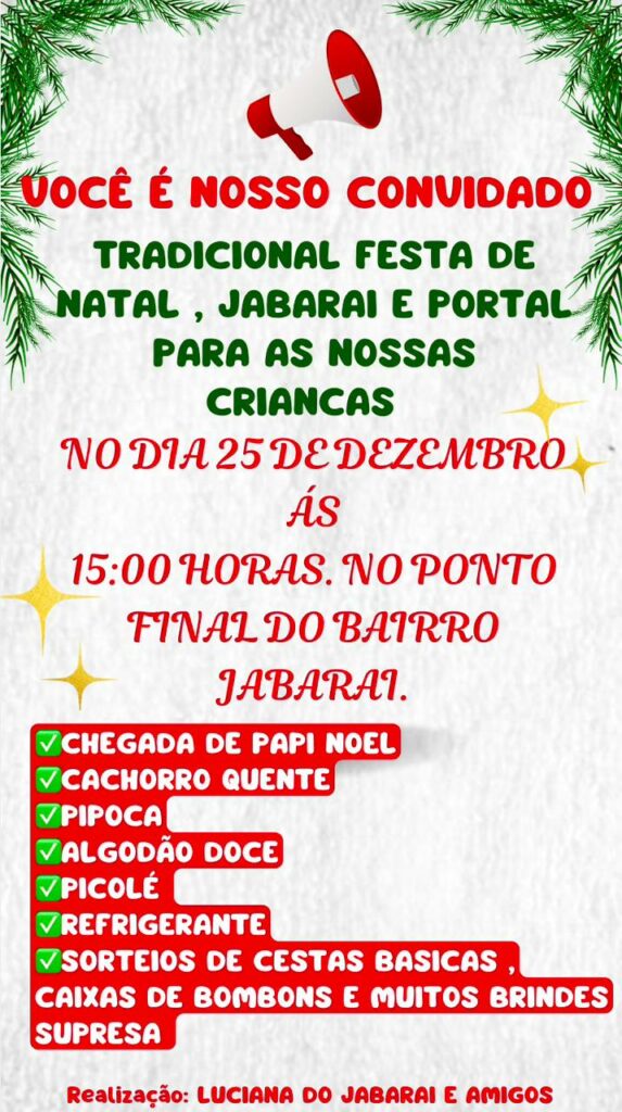 Realizada há mais de 20 anos, a tradicional festa de Natal para as crianças dos bairros Jabaraí e Portal, em Guarapari, acontece neste domingo (25), a partir das 15h, no ponto final do Jabaraí.