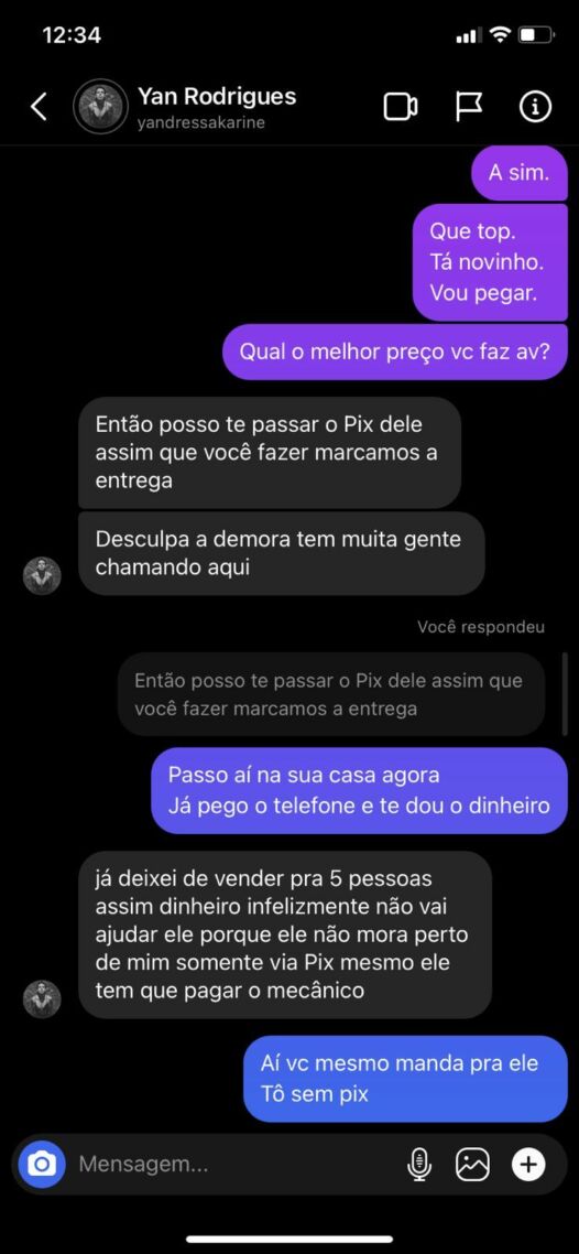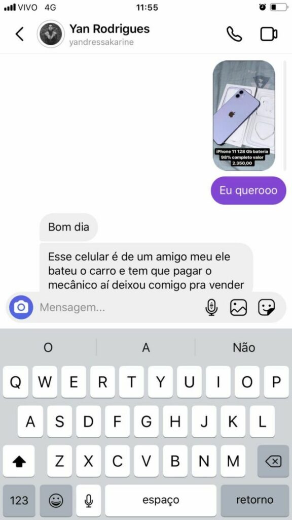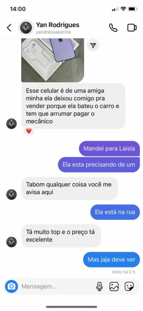 Segundo Yandressa, os golpistas que passaram a administrar o perfil estão realizando anúncios falsos de um smartphone por um preço abaixo da média de mercado para atrair vítimas. Se passando pela ambientalista, os criminosos criam uma narrativa em que o dinheiro precisa ser transferido para um terceiro e não deve ser entregue pessoalmente.