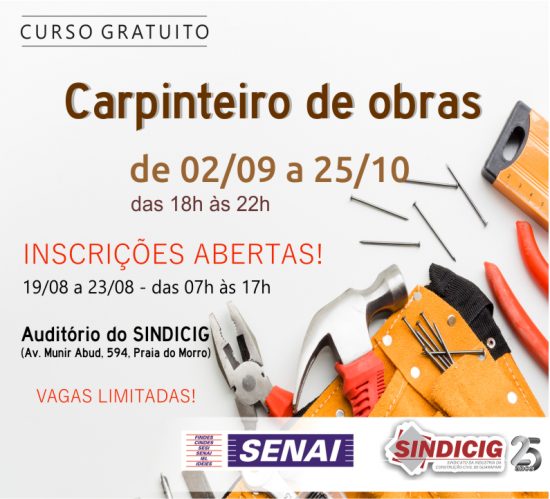 O Sindicato da Indústria da Construção Civil de Guarapari (Sindicig) está com inscrições abertas para um curso de carpinteiro de obras. Os interessados devem se inscrever até a próxima sexta-feira (23) na sede do Sindicig, localizada na Praia do Morro.