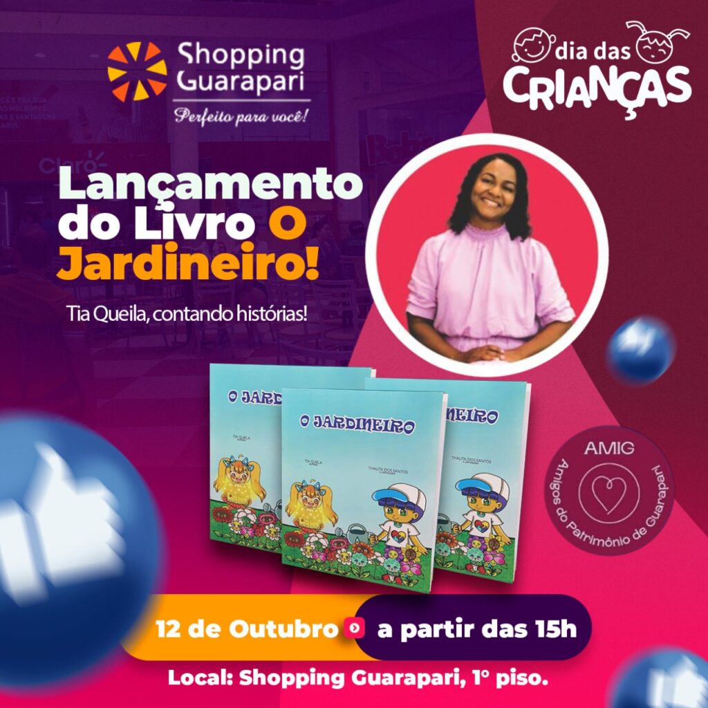 Um livro infantil da autora guarapariense Queila Gama será apresentado na próxima quarta-feira (12), quando é comemorado o Dia das Crianças, às 15h, no Shopping Guarapari. A ação é promovida pela “Associação Amigos do Patrimônio de Guarapari” (AMIG) e o livro em questão é “O Jardineiro”, que foi lançado em junho deste ano no Espaço Cultural Tzion.