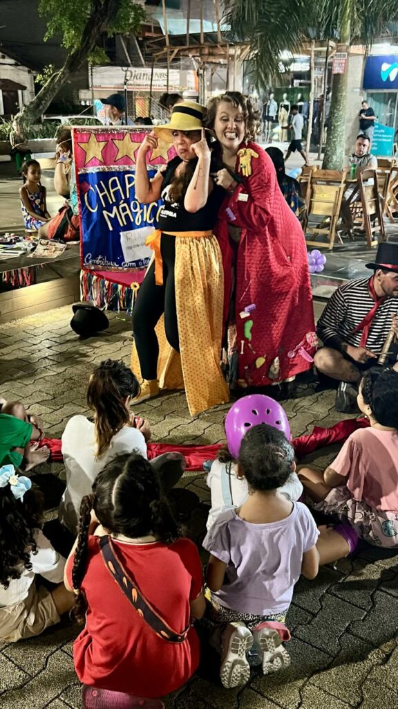 A Trupe Maratimba, grupo teatral de Guarapari, também preparou uma edição especial do Chapéu Mágico. A ação, que traz entretenimento infantil para as praças da cidade, será realizada neste sábado, a partir das 16h, na Praça do Bradesco. A programação inclui pintura infantil, escultura de balão, camarim de tererê, contação de histórias e brincadeiras, além de brindes. As atividades são oferecidas em troca de valores acessíveis.