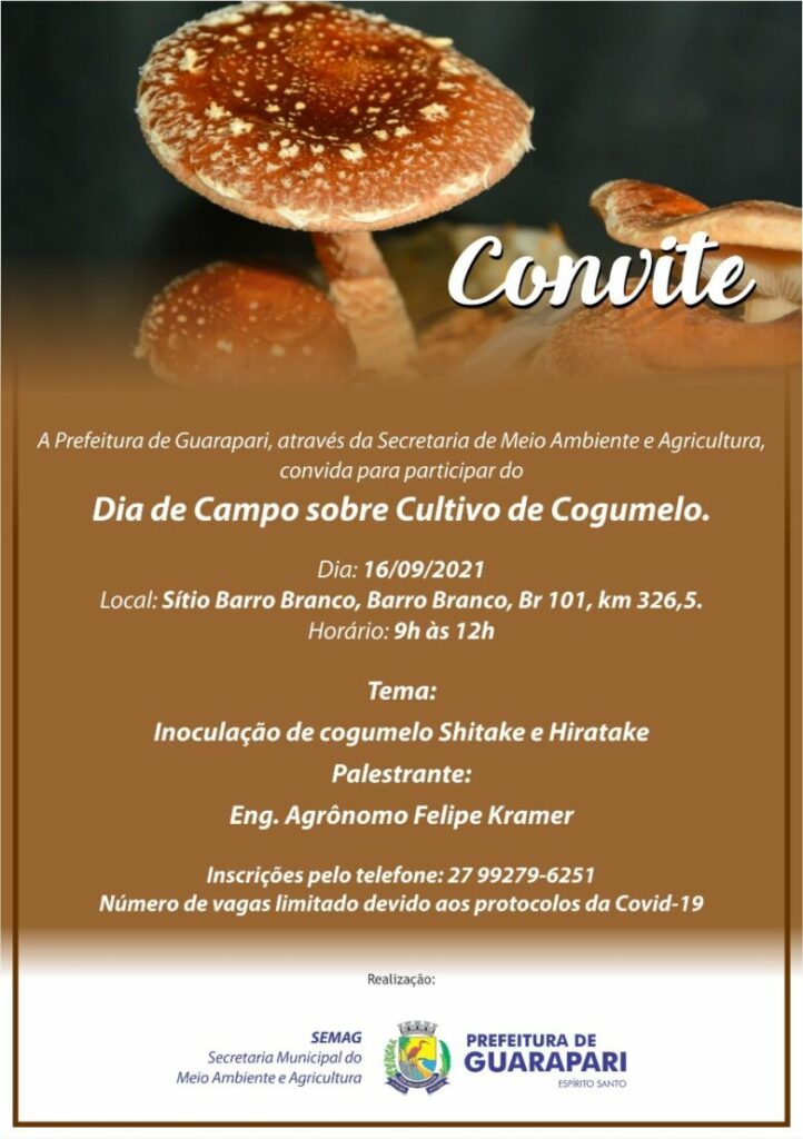 Nesta quinta-feira (16), a Prefeitura Municipal de Guarapari (PMG) promove um Dia de Campo sobre o cultivo de cogumelos comestíveis. A atividade, que é realizada pela Secretaria Municipal de Meio Ambiente e Agricultura (Semag), acontece no Sítio Barro Branco, na região de Barro Branco, zona rural de Guarapari.