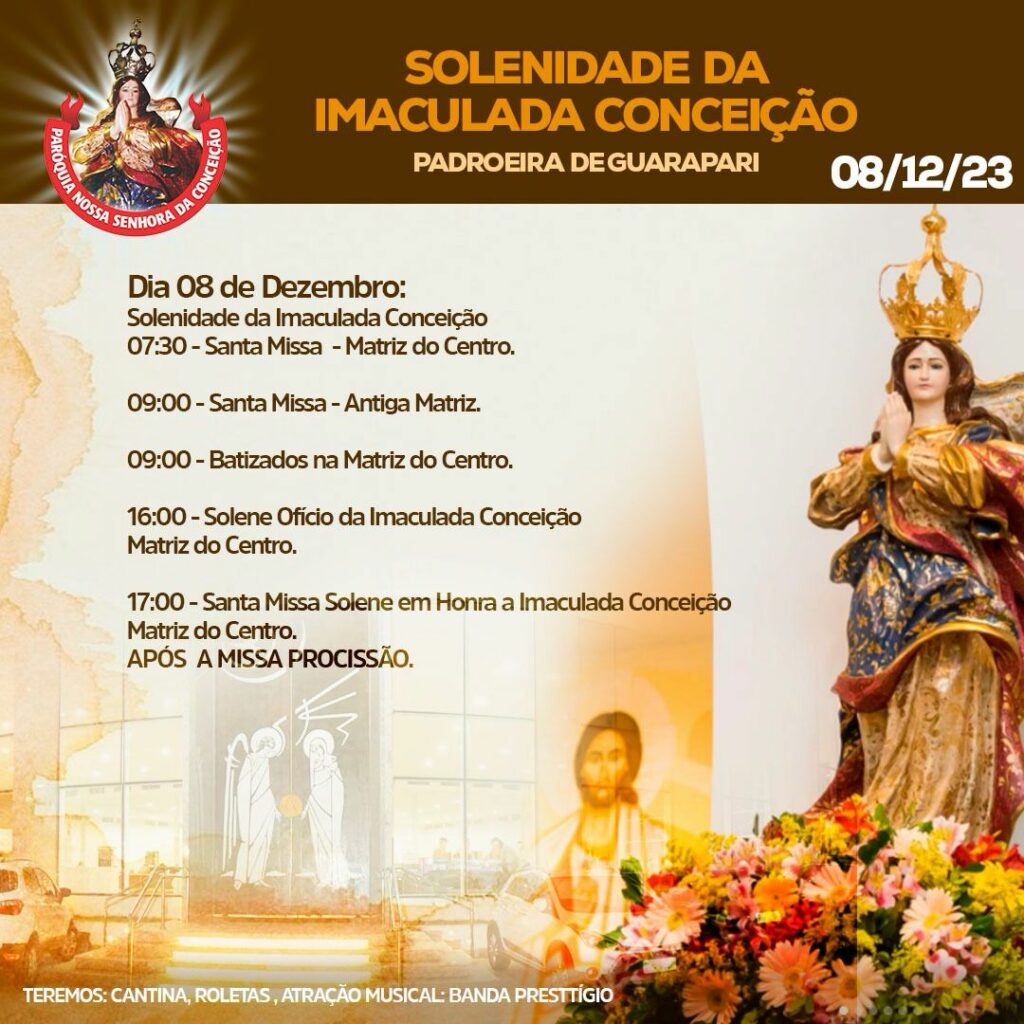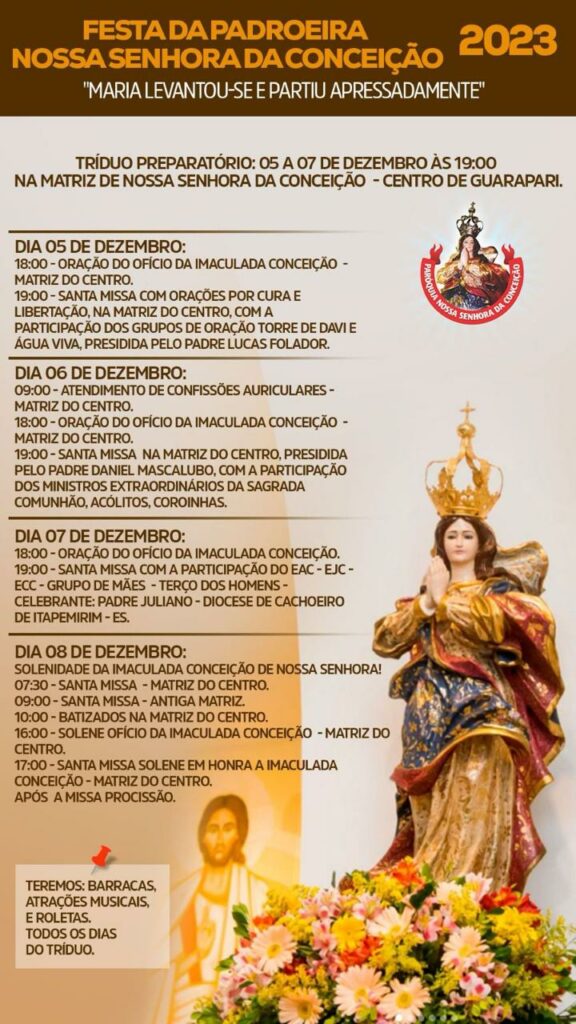 Nesse dia os católicos celebram a data com missas, batizados e procissão. A programação na Matriz Nossa Senhora da Conceição, localiza no Centro de Guarapari, inicia às 07h30 e segue até às 17h com Missa Solene pela Imaculada Conceição.