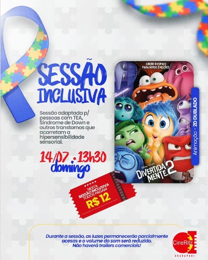 O Cine Ritz, no Shopping Guarapari, realiza neste domingo (14), às 13h30, uma Sessão Inclusiva para pessoas com Transtorno do Espectro Autista (TEA), Síndrome de Down e outros transtornos que acarretam a hipersensibilidade sensorial. O filme em cartaz será a animação “Divertidamente 2”.