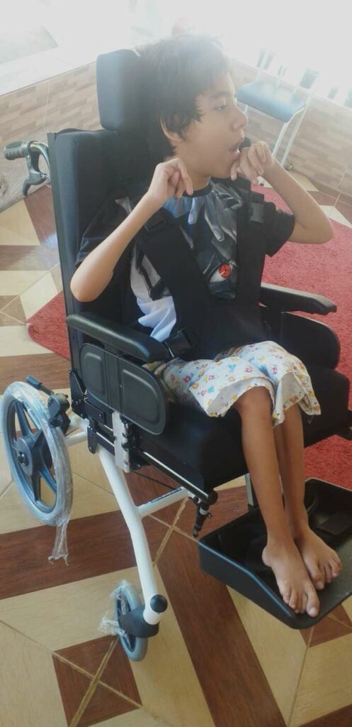 Gabriel, prestes a completar 13 anos, é diagnosticado com hidrocefalia, paralisia cerebral, epilepsia e autismo, e a cadeira de rodas que estava utilizando ganhou com seis anos e estava muito pequena.