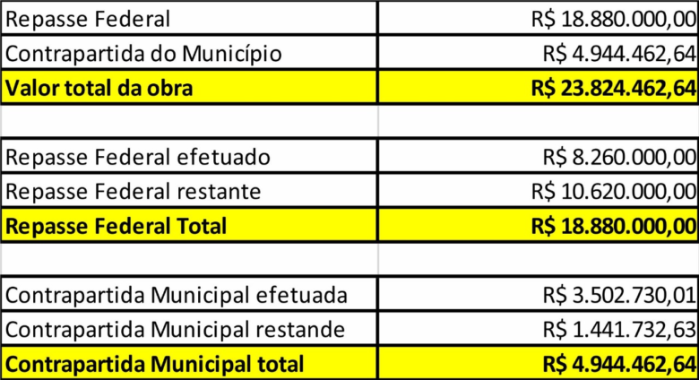 Conforme já informado pelo município e segundo os documentos do banco, o valor total da obra é de R$23.824462,64 (vinte e três milhões, oitocentos e vinte e quatro mil, quatrocentos e sessenta e dois reais e sessenta e quatro centavos). Desse quantitativo, é dever do Governo Federal repassar R$18.880.000,00 (dezoito milhões oitocentos e oitenta mil reais), mas até o momento só repassou R$8.260.00,00 (oito milhões, duzentos e sessenta mil reais), o que permitiu, juntamente com a contrapartida do município, o pagamento de 53,16% do serviço. Sendo assim, ainda faltam repasses a serem realizados pelo o Governo Federal, no montante de R$10.620.000,00 (dez milhões, seiscentos e vinte mil reais).
