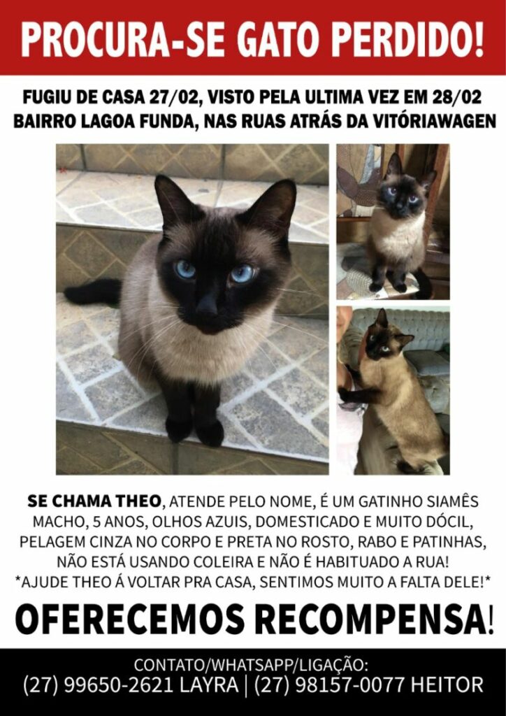 Heitor contou que o gato fugiu da casa da namorada, no bairro Lagoa Funda, atrás da concessionária Vitóriawagen. “Theo é muito inocente, sempre foi criado em casa e não tem contato com animais de rua. Provavelmente aproveitou uma brecha pra subir o muro que é alto, onde geralmente não alcança, e deve ter subido em algum carro ou uma árvore por perto. O hábito de fuga não é normal”.