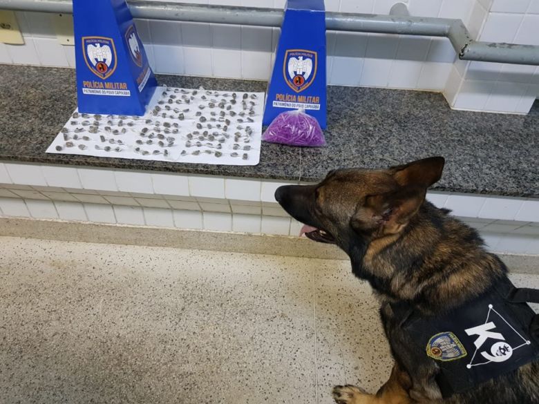 Na tarde de sábado (11), policiais militares localizaram uma sacola contendo 130 buchas de maconha. O entorpecente estava dividido em 13 lotes com 10 unidades, pronto para venda. A ação, que contou com apoio do cão policial Mike, se deu no bairro Jabaraí. Foi localizado ainda material para embalo de entorpecentes. Não houve detidos.