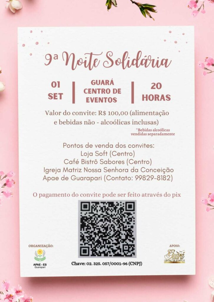 A 9ª Noite Solidária terá início às 20h, no Guará Centro de Eventos, em Itapebussu. Haverá música ao vivo, bingo, exposição de artesanato e sorteios. O valor do convite é R$ 100, com direito a alimentação e bebidas não alcóolicas, e pode ser adquirido diretamente na Apae.