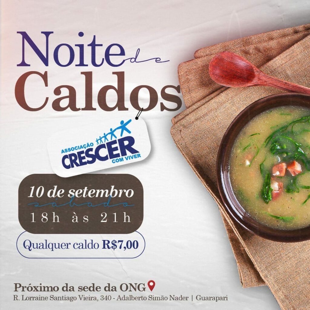 A Organização Não Governamental – ONG Crescer Com Viver irá realizar amanhã (10) uma “Noite de Caldos” em prol de arrecadar valores para que a Associação continue funcionando.