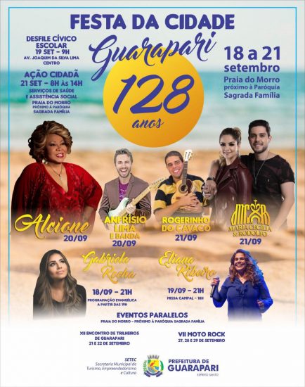 A cidade de Guarapari completa amanhã (19) 128 anos de Emancipação Política* e uma festa para comemorar a data está sendo preparada para moradores e turistas. Entre as atrações, estão shows nacionais como o da sambista Alcione, da dupla Maria Cecília e Rodolfo, da cantora evangélica Gabriela Rocha e da cantora católica Eliana Ribeiro.