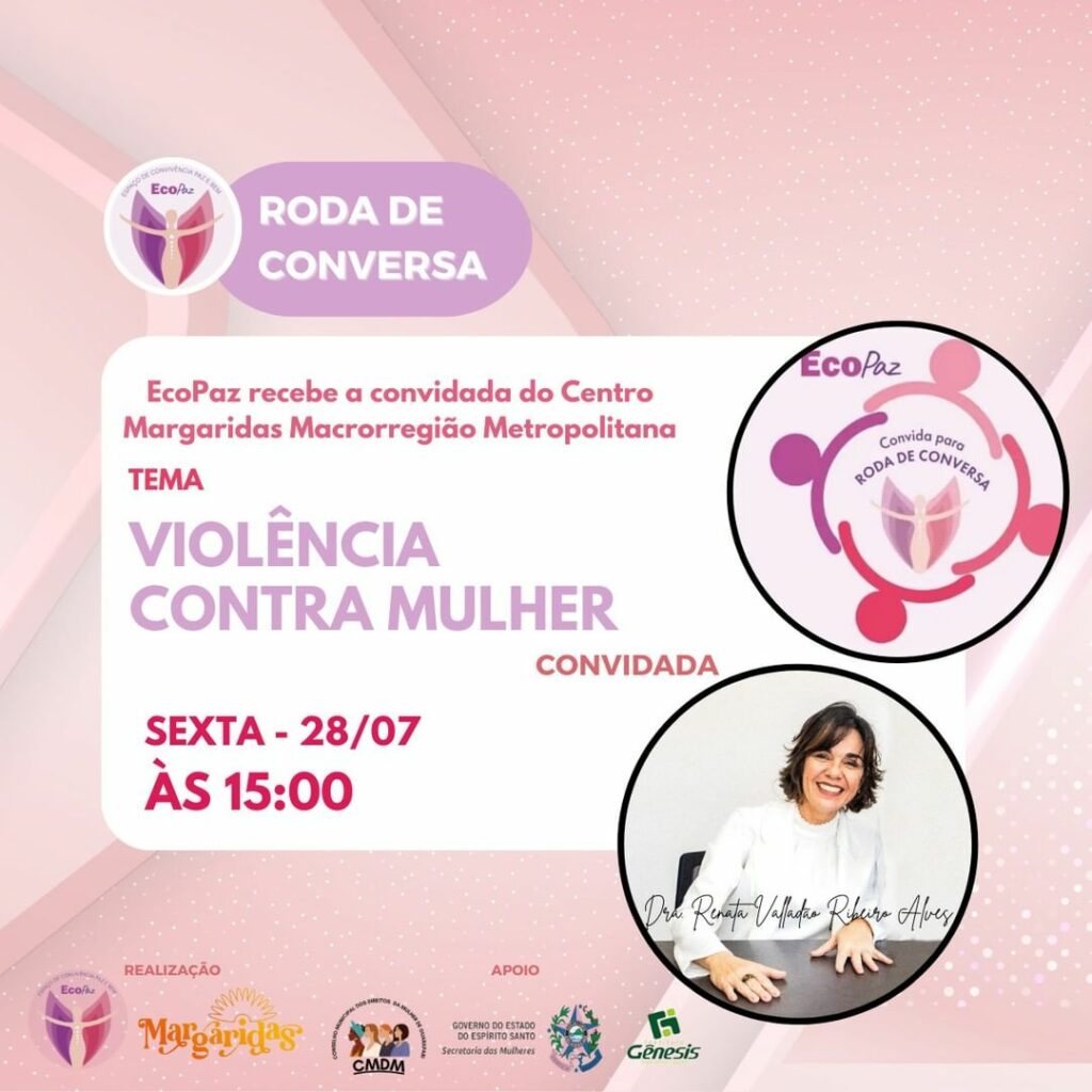 O Espaço de Convivência Paz e Bem (EcoPaz), em Guarapari, recebe nesta sexta-feira (28), às 15h, uma roda de conversa com o tema “Violência contra a Mulher”. O debate será mediado pela Dra. Renata Valadão Ribeiro Alves, advogada do Centro de Margaridas Macrorregião Metropolitana de Cariacica.