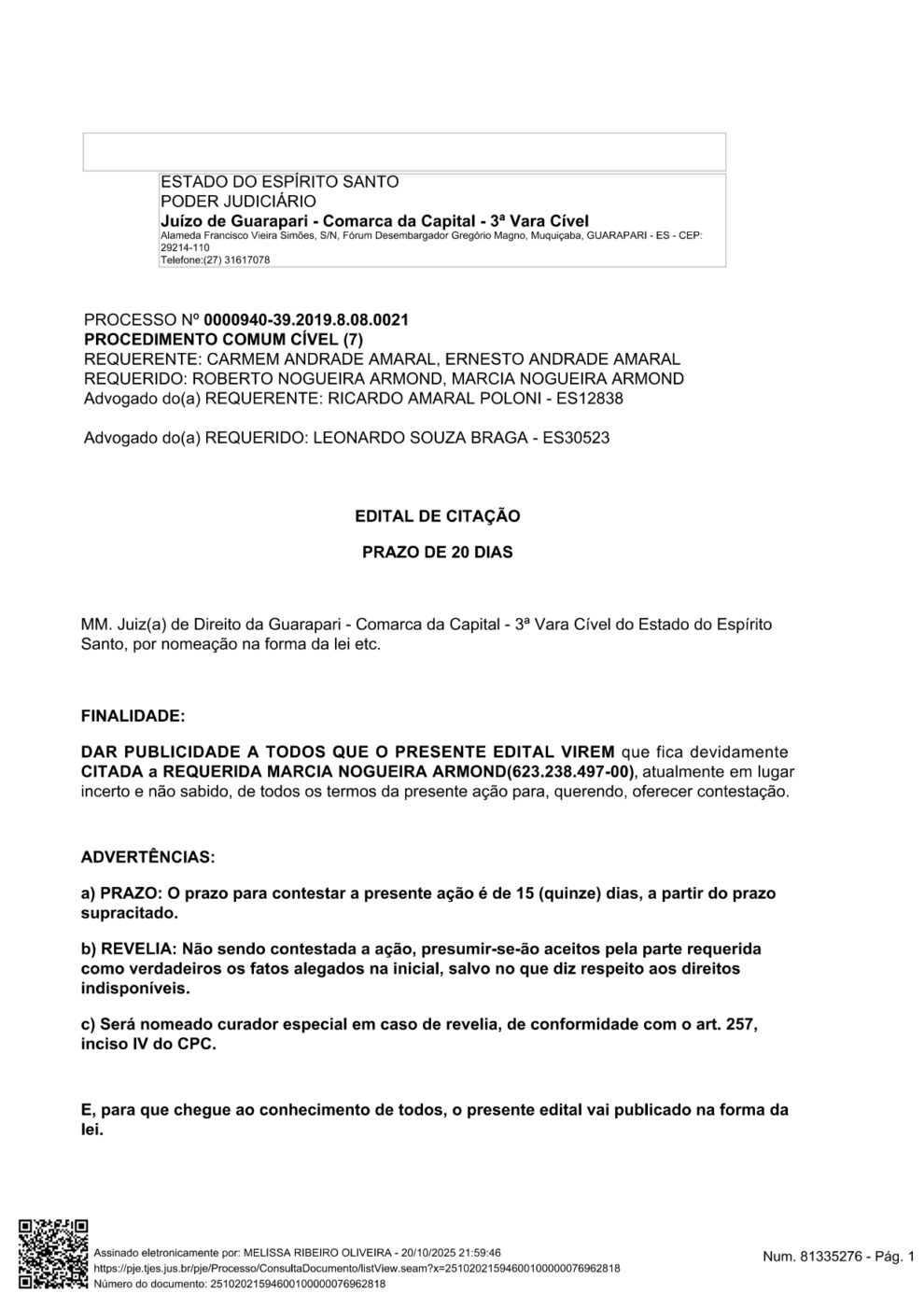 Edital de citação Ernesto Andrade Amaral X Marcia Nogueira Armond, autos 0000940-39.2019.8.08.0021