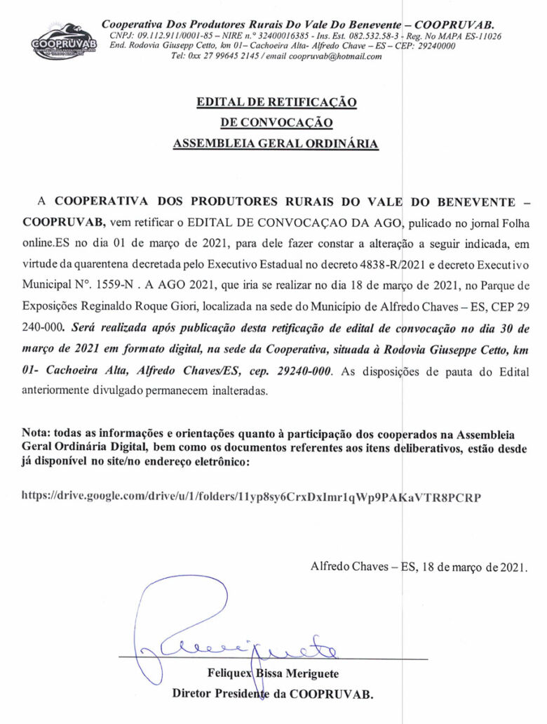 COOPRUVAB – Edital de Retificação de Convocação Assembleia Geral Ordinária