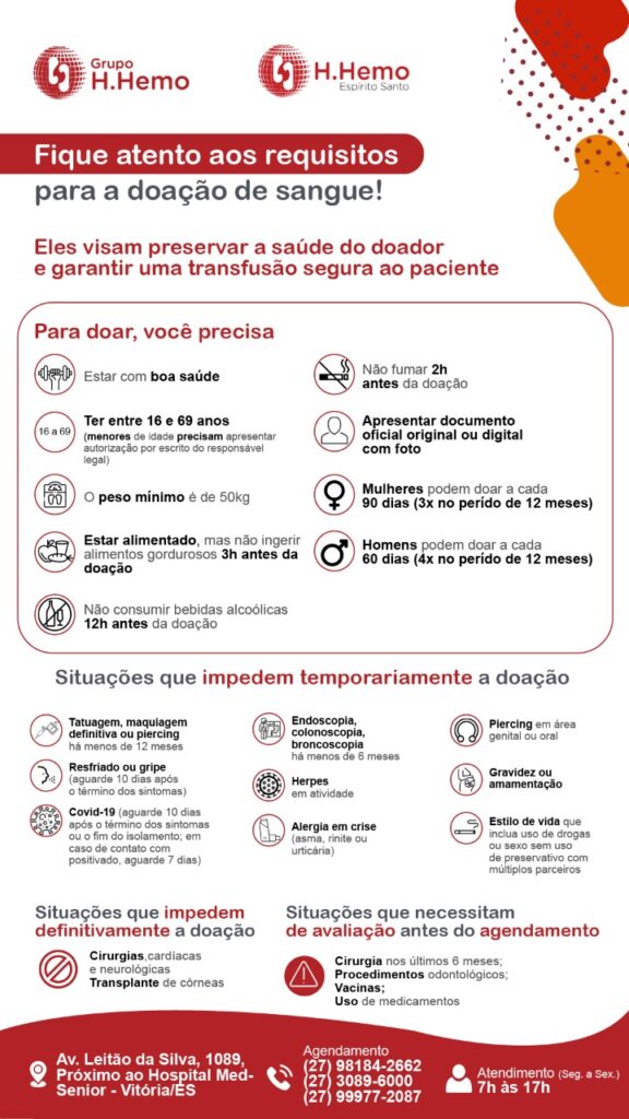 As doações estão sendo recebidas na sede do H.Hemo, na avenida Leitão da Silva, 1089, em Gurigica, Vitória. O local funciona de segunda a sexta, das 07h às 17h. Mais informações estão disponíveis através dos telefones (27) 3089-6000, (27) 98184-2662, (27) 99977-2087.