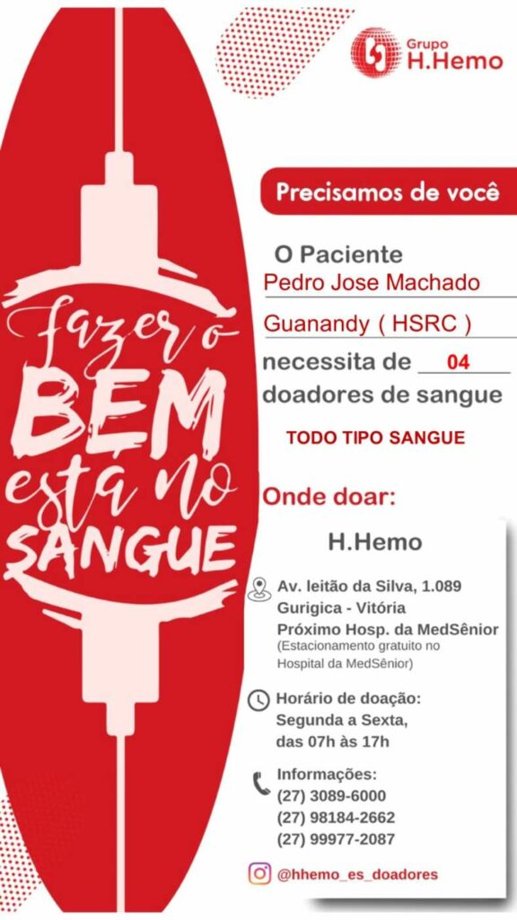 O pedido vem através do irmão mais novo, Paulo Henrique Guanandy. Segundo ele, Pedro, que tem 63 anos, deve precisar de mais doadores futuramente. “Ele fez a primeira sessão de quimio e precisou de quatro bolsas de sangue, e irá fazer mais 12 sessões. Então vai precisar de mais doações. O pedido é para repor o banco de sangue do instituto”, explicou Paulo.