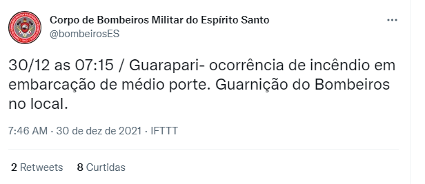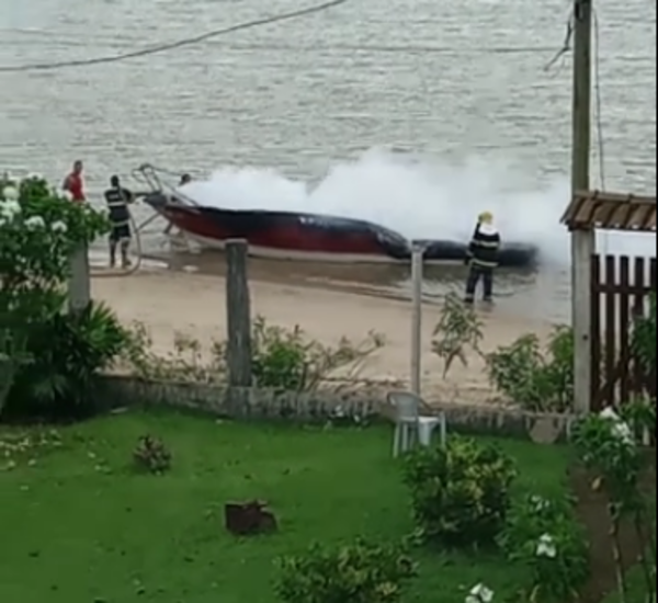“O Corpo de Bombeiros Militar foi acionado para atender uma ocorrência de incêndio em embarcação, por volta das 7h, no bairro Santa Mônica, em Guarapari. O condutor havia acabado de sair de uma marina na Praia do Boião, quando a lancha começou a pegar fogo na água. Imediatamente ele pulou e não ficou ferido.O proprietário da marina, com outro barco, foi até a lancha, socorreu o condutor, que havia pulado, e rebocou a embarcação em chamas para perto da areia, onde a equipe realizou o combate ao fogo e o extinguiu”, informou o CBMES por meio de nota.