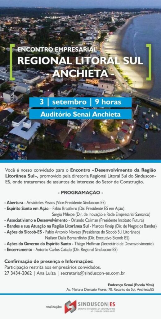 Nesta sexta-feira (03) o Sindicato da Indústria da Construção Civil no Estado do Espírito Santo (Sinduscon – ES) realiza o Encontro Empresarial Regional Litoral Sul, em Anchieta.
