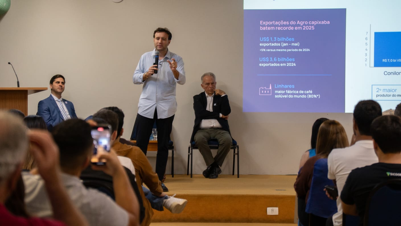 Ele apresentou dados expressivos da economia capixaba, destacando que o estado é líder global na produção de café solúvel, o segundo maior produtor de café conilon do mundo e que 28% do PIB capixaba está concentrado no agronegócio.