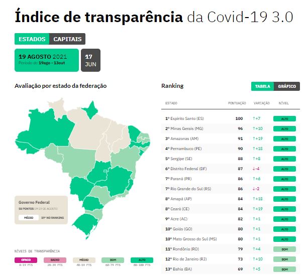 O Estado do Espírito Santo alcançou nesta semana a posição de destaque no ranking da Open Knowledge Brasil (OKBR) que analise a transparência na gestão da pandemia da Covid-19. O Estado subiu 7 pontos e alcançou 100 pontos no Índice de Transparência Covid-19 (ITC-19), ficando na melhor posição isolada entre os estados brasileiros.
