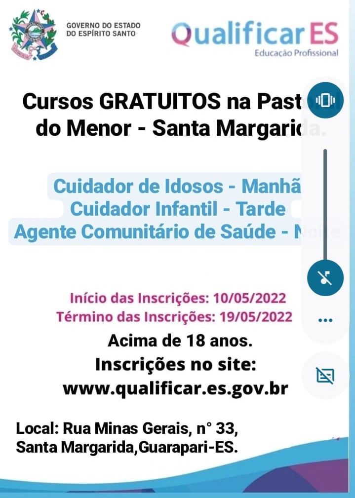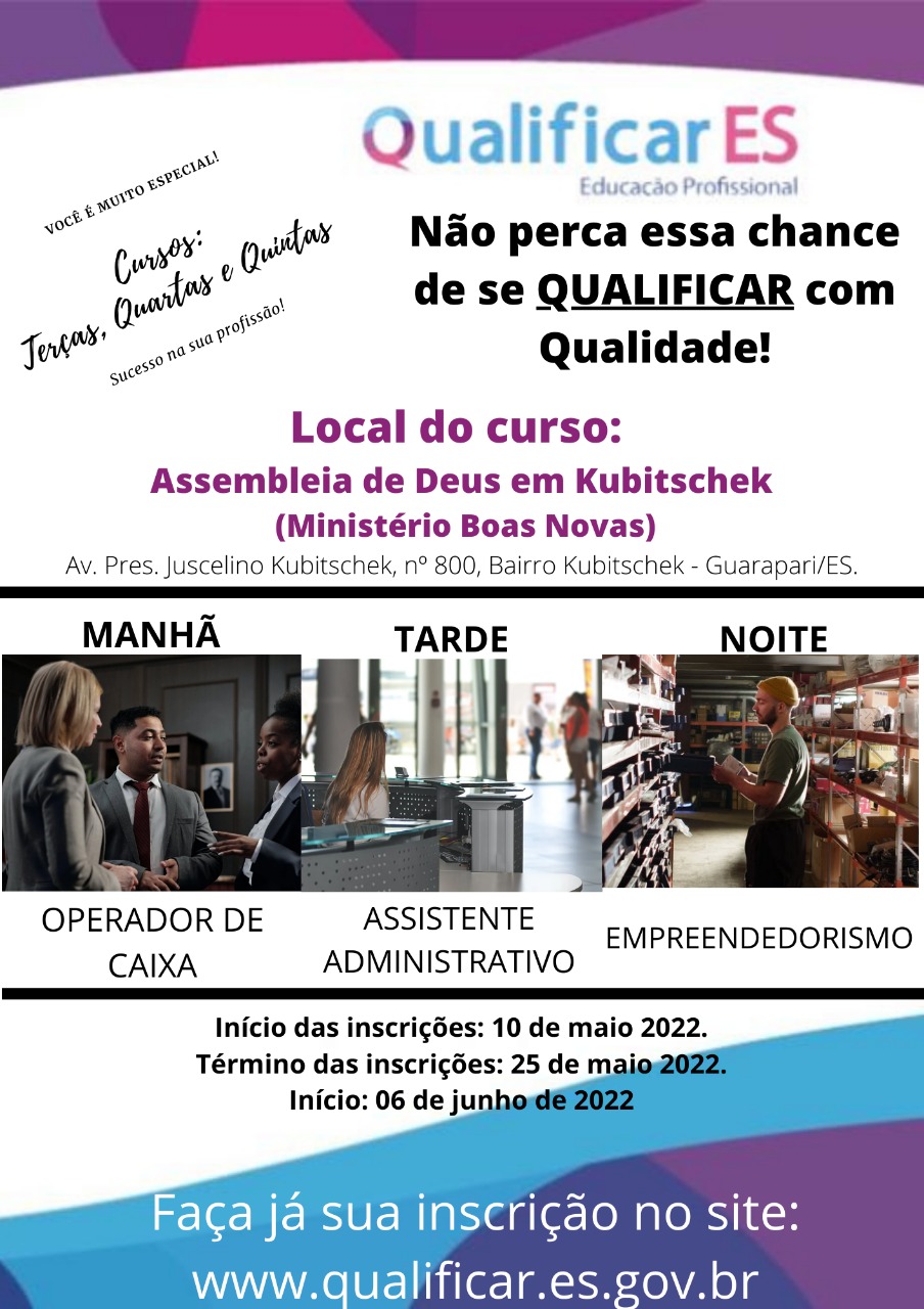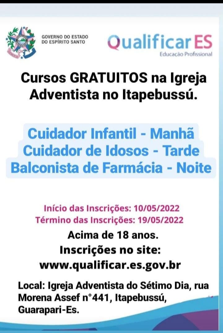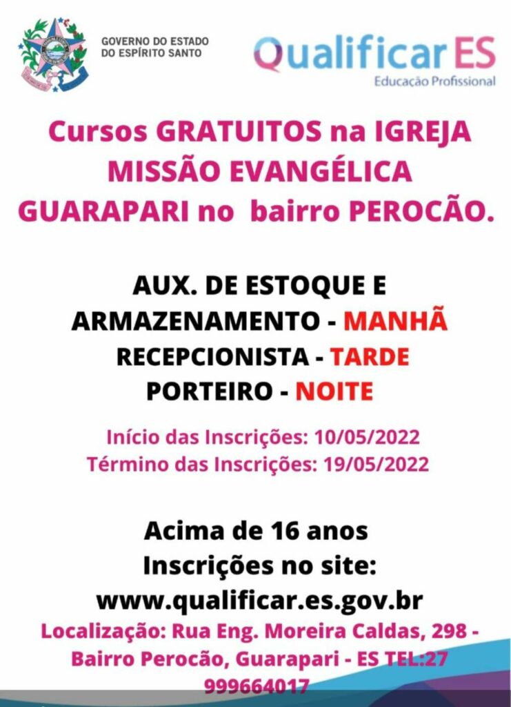 Até a próxima quinta-feira (19), o Qualificar ES está com inscrições abertas para quem quer concorrer a vagas em cursos presenciais de qualificação profissional gratuitos, que serão ofertados nos oito polos presenciais do programa em bairros de Guarapari. Ofertado pelo Governo do Estado do Espírito Santo, o programa possui, em Guarapari, polos distribuídos nos bairros Adalberto Simão Nader, Coroado, Santa Margarida, Kubitscheck, Itapebussu, Jabaraí e Perocão.