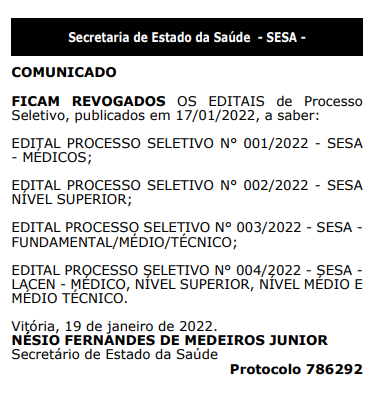 Publicados no Diário Oficial do Espírito Santo, na segunda-feira (17), pela Secretaria da Saúde (Sesa), os quatro editais para o processo seletivo para cargos de níveis Superior, Técnico, Médio e Fundamental, foram revogados hoje (20) e o processo seletivo cancelado.