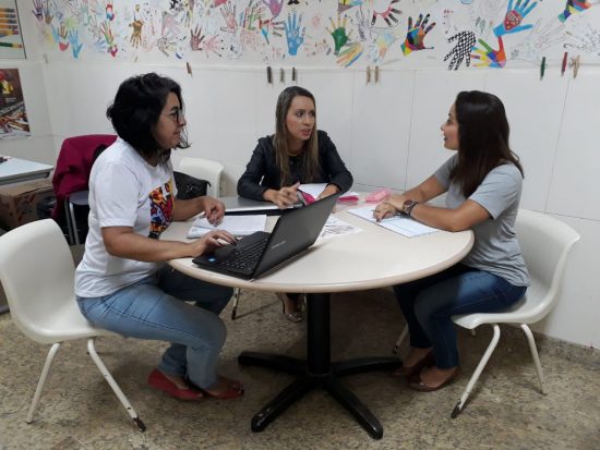 Professoras Fernanda Geraldo (esquerda), Daiane Pinhal e Cynthia Gonçalves durante o desenvolvimento do projeto.