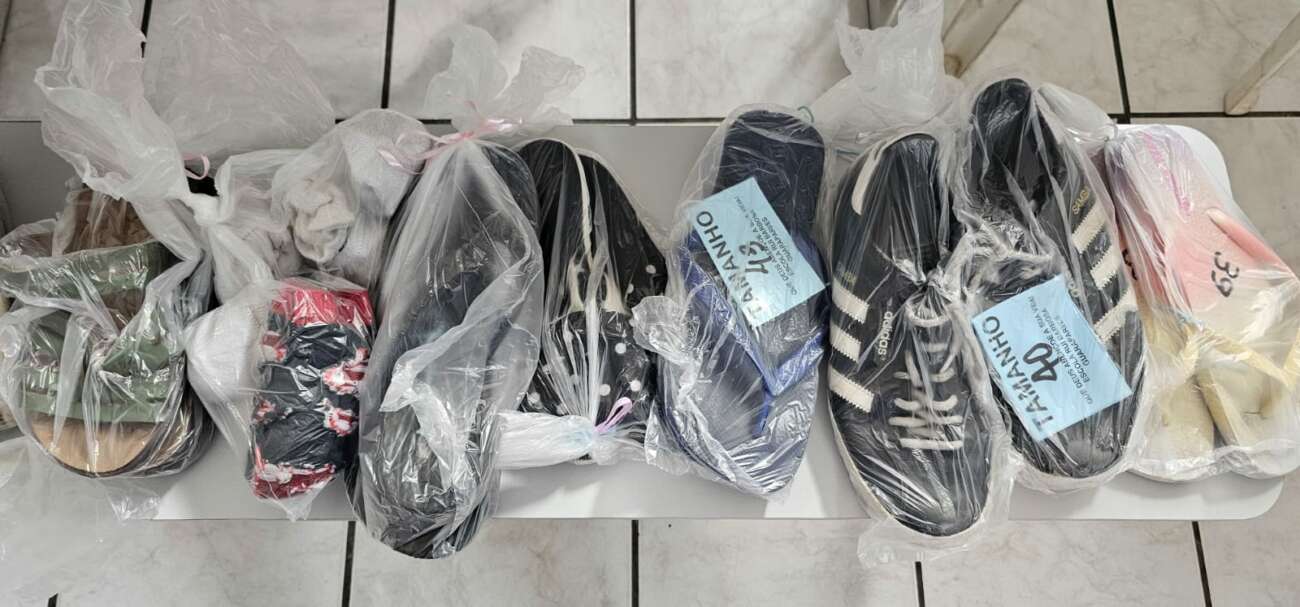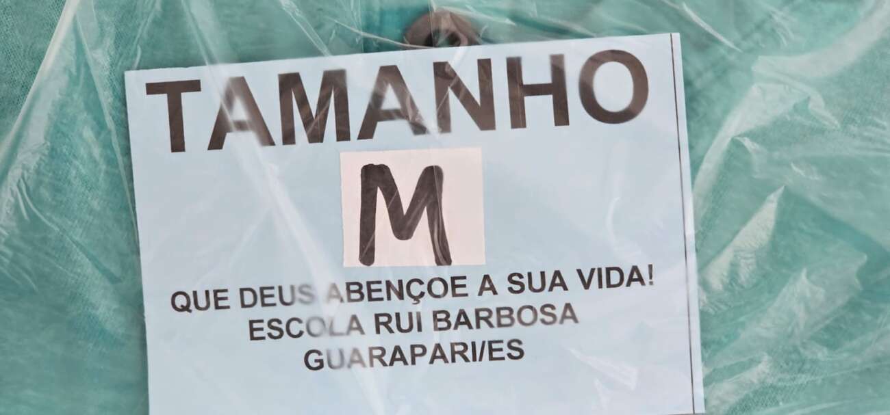 Durante duas semanas, inúmeras doações de roupas e calçados chegaram à escola. Todas foram separadas em sacolas plásticas transparentes, aromatizadas e com tamanhos identificados para facilitar a entrega dos itens.