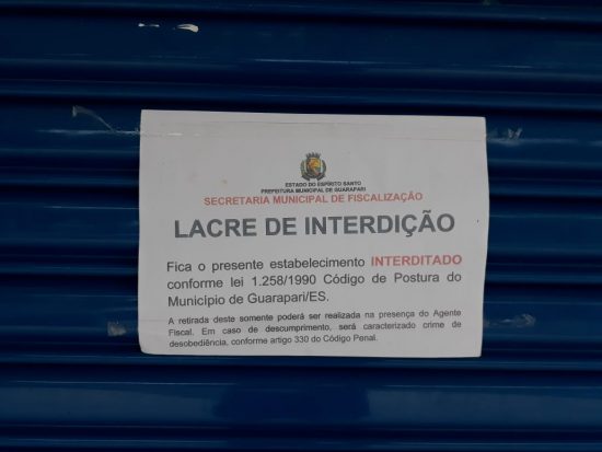 O comércio foi fechado por causa do decreto estadual e teve um lacre de interdição colocado por não ter renovado o alvará de funcionamento