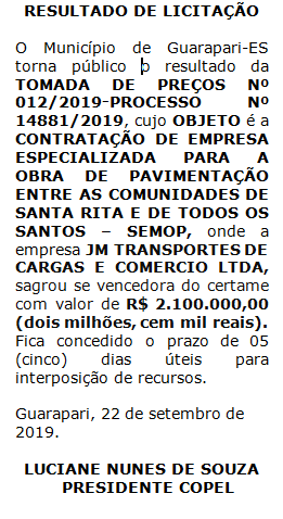 Com trâmites ainda em andamento, nessa segunda-feira (23), a Prefeitura de Guarapari publicou em Diário Oficial o resultado da licitação para tomada de preços relativa à obra de pavimentação da via entre as comunidades de Santa Rita e Todos os Santos, interior do município.