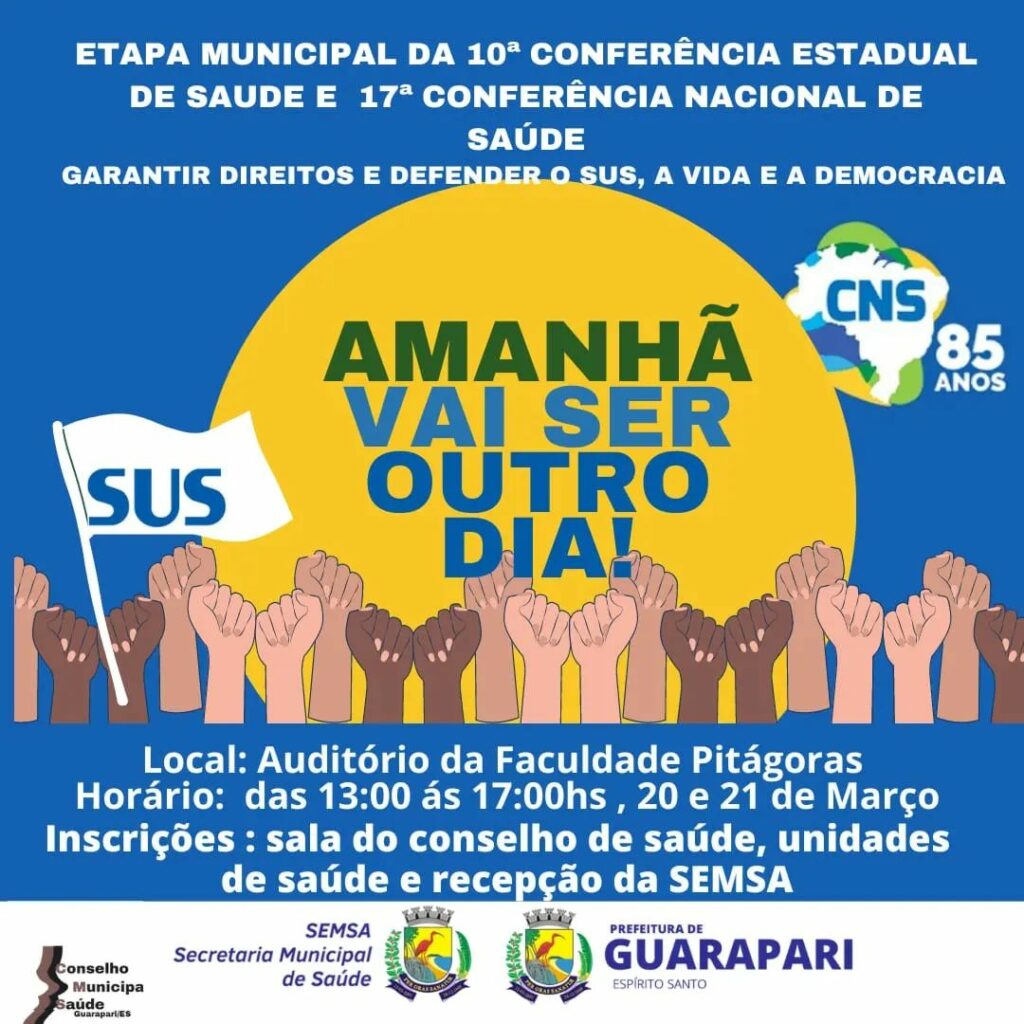 A Secretaria de Saúde de Guarapari e o Conselho Municipal de Saúde realizam nesta segunda (20) e terça (21) a Etapa Municipal da 10ª Conferência Estadual de Saúde e 17ª Conferência Nacional de Saúde. O encontro acontece das 13h às 17h, no Auditório da Faculdade Anhanguera, em Muquiçaba.