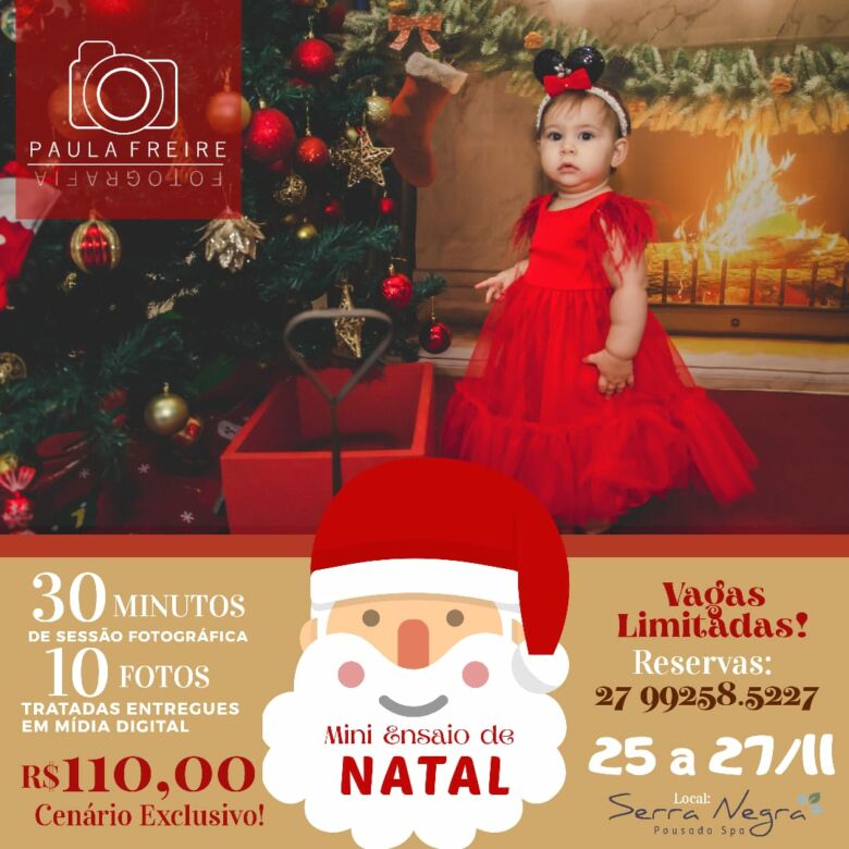 Nenhuma data encanta tanto as crianças quanto o Natal. Pensando nos pais que gostariam de eternizar a magia dos primeiros natais em família junto dos pequenos, a fotógrafa Paula Freire decidiu realizar uma mini sessão natalina, entre os dias 25, 26 e 27 de novembro, na Serra Negra Pousada Spa, em Guarapari.