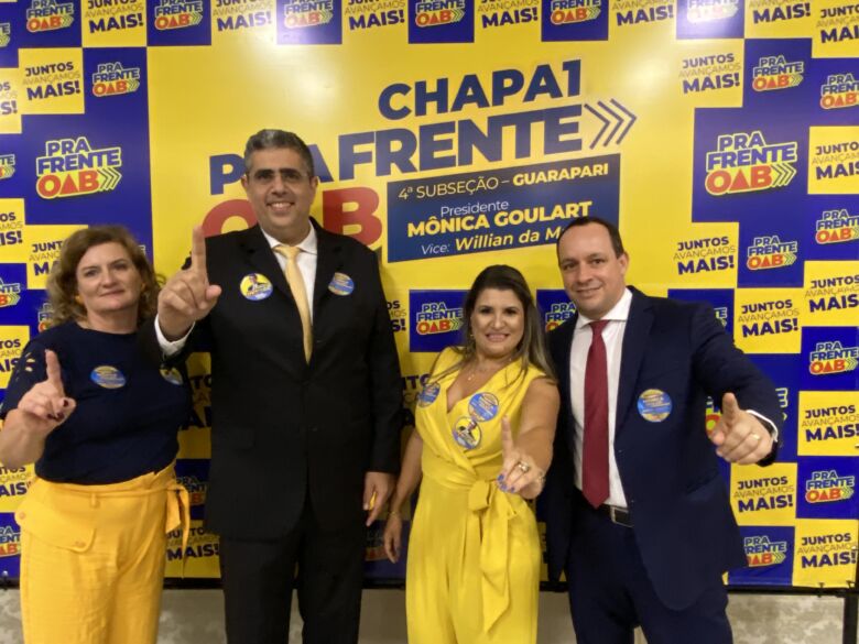 Anabela Galvão (vice-presidente da chapa à OAB-ES) e Mônica Ferreira Goulart Anabela Galvão, José Carlos Rizk Filho, Mônica Ferreira Goulart e William Bergamini Advogado Carlos Lázaro, Luciana Mattar (Conselheira Federal da OAB), Jedson Maioli (Conselheiro Federal da OAB) e advogado João Paulo Advogados Cláudio Goulart, Elaine Simões e Thiago Gobbi Advogado Tássio Brunoro