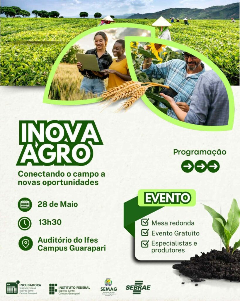 O evento reunirá produtores rurais, estudantes, especialistas e empreendedores para discutir como a tecnologia, a sustentabilidade e o empreendedorismo podem transformar o setor agropecuário capixaba. O Inova Agro conta com o apoio da Secretaria Municipal de Agricultura e Expansão Rural de Guarapari (SEMAG) e do Sebrae.