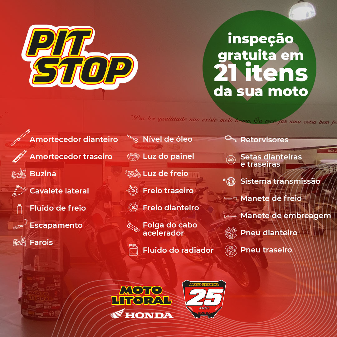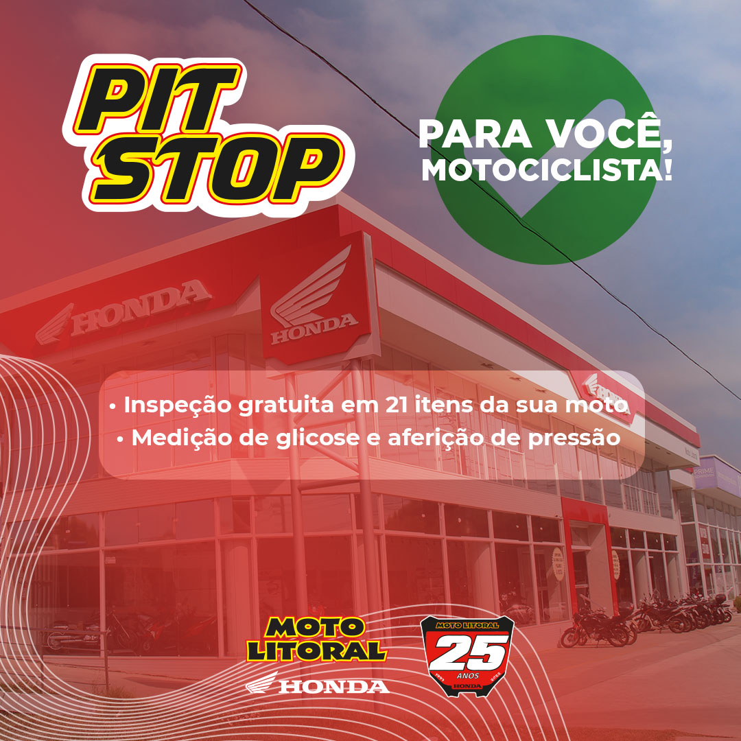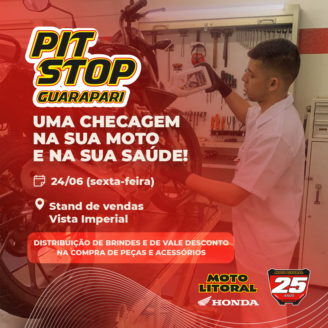 Dedicando uma atenção a mais aos motociclistas, durante os próximos meses serão realizadas três edições do tradicional Pit Stop, com a revisão de 21 itens da moto, além de medição de glicose e aferição de pressão para motociclistas, e distribuição de brindes. As datas de cada Pit Stop já estão marcadas: dias 24 de junho e 27 de julho, em Guarapari, e no dia 5 de agosto, em Anchieta.