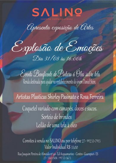 Uma exposição de artes beneficente será realizada nesse sábado (31), em Guarapari. A iniciativa tem o objetivo de arrecadar fundos para o tratamento do jovem Daniel Stein, de 20 anos, que sofreu uma Hipoxia Cerebral há três anos. O evento, que contará também com um coquetel incluído no valor da entrada, acontece a partir das 16h no Restaurante Salino, localizado no centro da cidade.