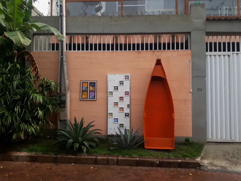 Com minha admiração pelo mar, foi fácil escolher os elementos: um barco batera, uma boia de escuna, um barcão da artista plástica Celma Martins, porta e janela com meus livros e dois guarás.