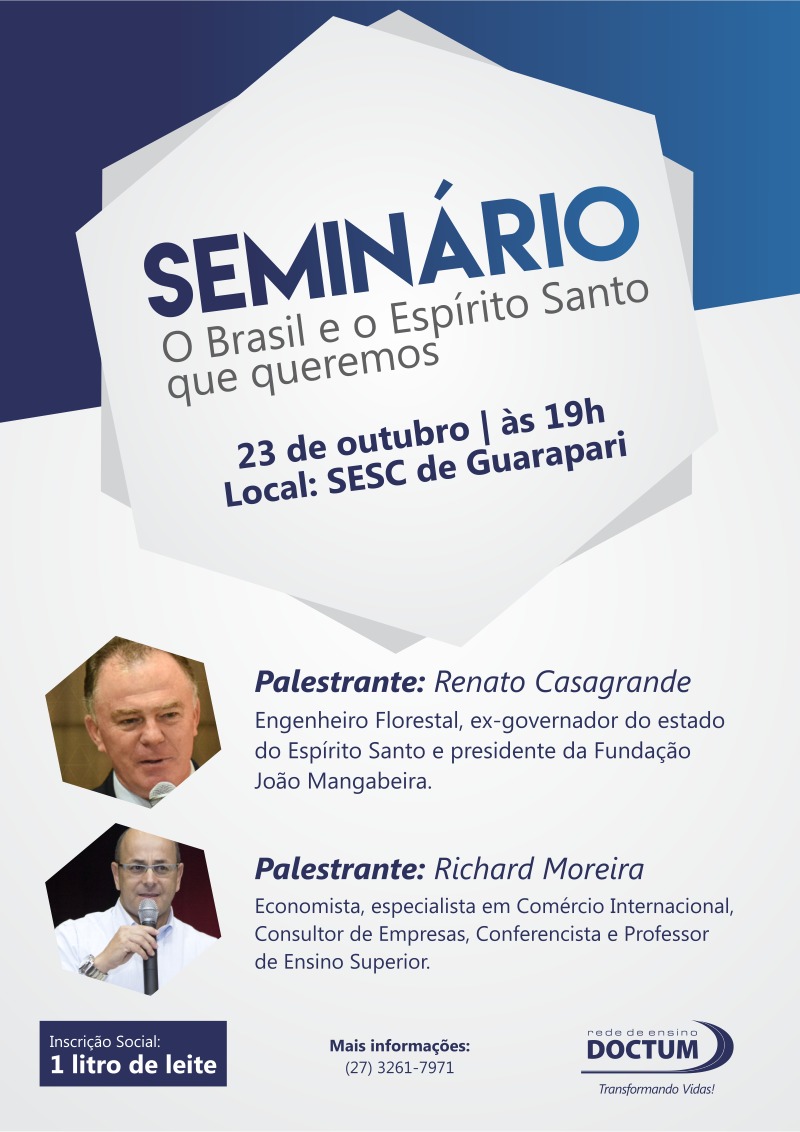Discutir sobre questões do Brasil e da cidade em que se vive nunca é demais. Para envolver a população guarapariense em temas gerais e agregar conhecimento, a Rede de Ensino Doctum oferece na próxima segunda-feira (23), a partir das 19h, no auditório do Sesc, o seminário com o tema “O Brasil e o Espírito Santo que queremos”. Com os palestrantes Renato Casagrande e Richard Moreira, especialistas em assuntos de relevância na visão privada e pública, a população poderá debater e opinar durante o evento. Através da doação de 1l de leite, a inscrição poderá ser feita na hora e no local.