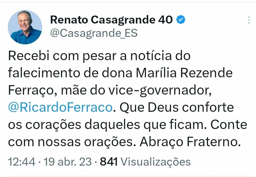 O próprio filho divulgou a informação sobre o falecimento da mãe, por meio de uma postagem na rede social. Na publicação, Ferraço agradeceu apoio recebido nesse momento difícil.