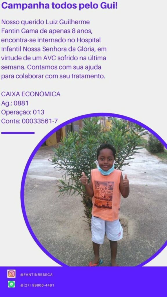 Na última quarta-feira (25) Luiz Guilherme sofreu um Acidente Vascular Cerebral hemorrágico. Ela conta que o filho estava assistindo televisão quando começou a sentir dores de cabeça. “Ele estava na casa da tia, assistindo TV quando reclamou de uma dor no olho. A prima trouxe ele em casa, que é no mesmo quintal. Lá ele disse que estava sentindo uma dor de cabeça muito forte”, explicou a mãe de Luiz Guilherme, Claudia Fantin.